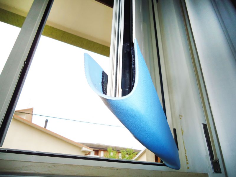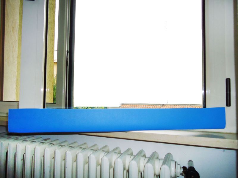 Protezione morbida in pvc espanso azzurra, realizzata su misura per proteggere gli spigoli delle finestre quando sono aperte, garantendo una copertura totale anche della parte inferiore dell'anta. La protezione si installa mediante velcro che consente di poter sganciare da un lato la protezione permettendo così la chiusura della finestra
